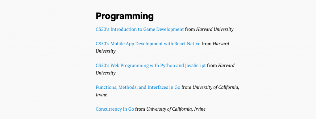 Quartz have put together a list of the 600 courses recently released online by 190 universities. The courses cover programming, engineering, computer science, social studies, science, art & design, mathematics, humanities, business, health & medicine, data science, education & teaching and personal development.