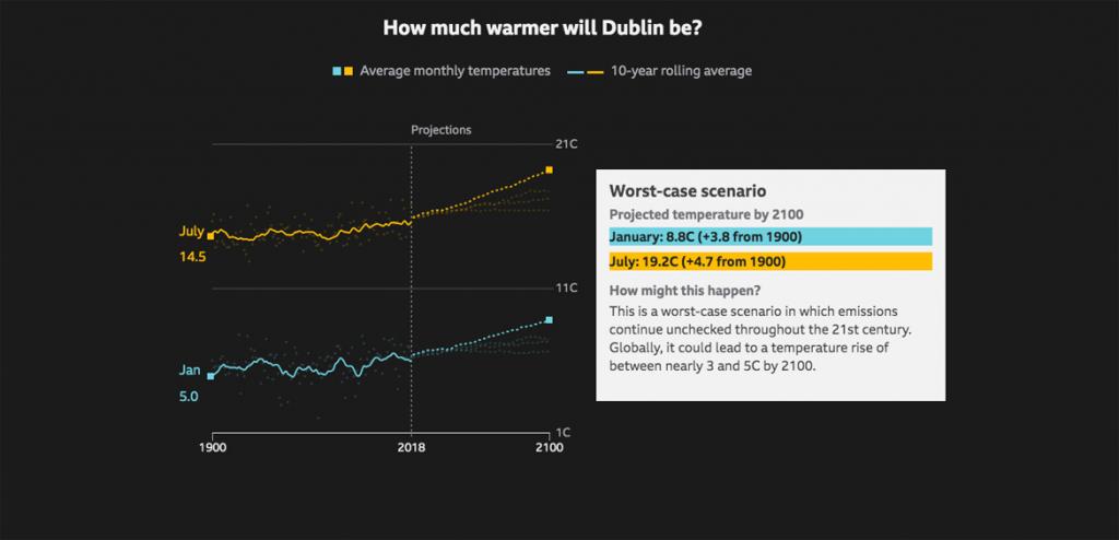 BBC News published an interesting interactive data visualisation showing the best case, medium-low, medium-high and worst case projected temperature increase scenarios for cities by 2100.