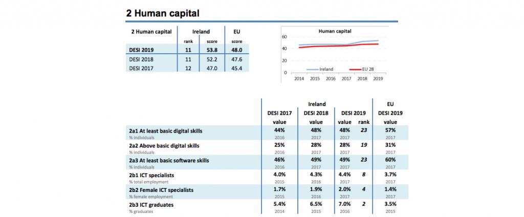 The European Commission has released the results of the Digital Economy and Society Index (DESI) 2019 for all EU countries. The results track each country against the EU index across Connectivity, Human Capital, Use of Internet Services, Integration of Digital Technology, and Digital Public Access.