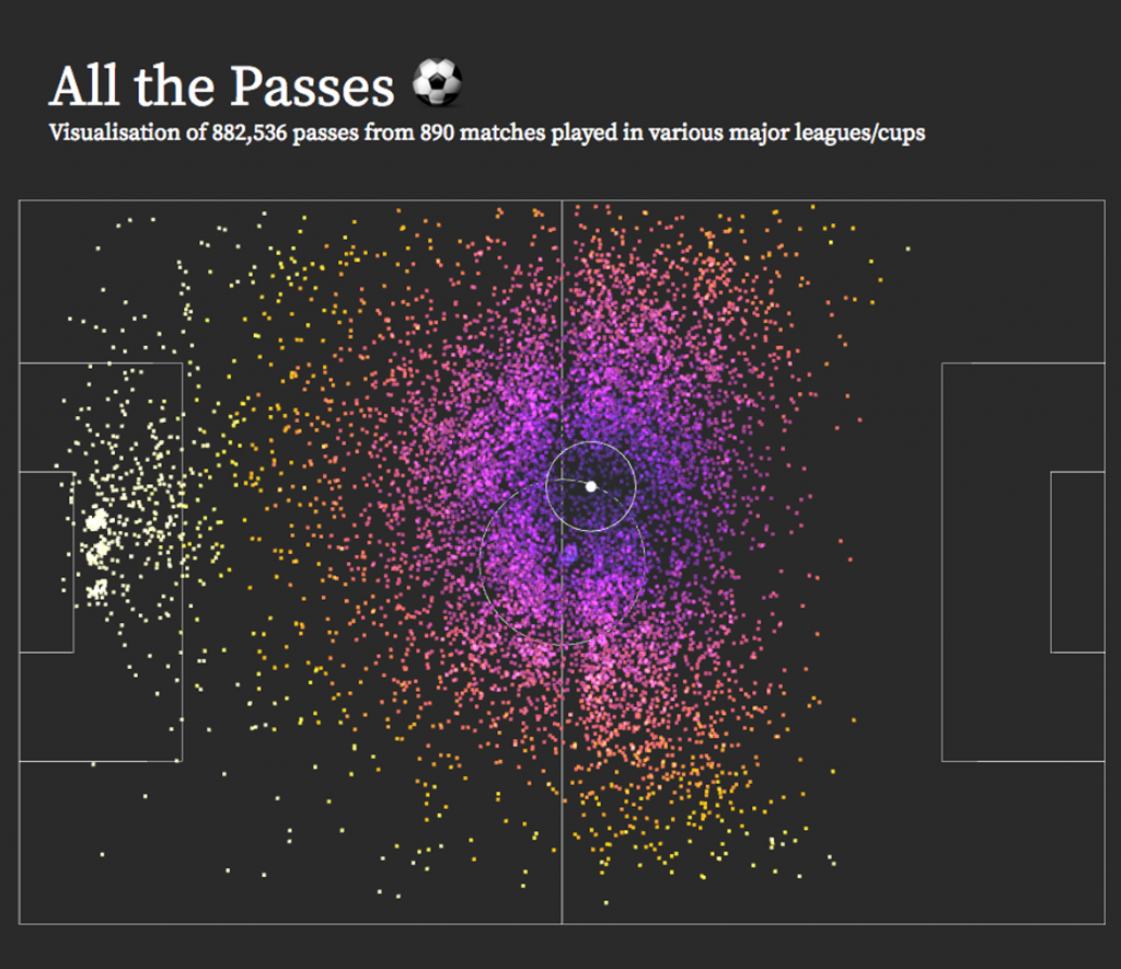 Karim Douieb published a great interactive visualisation on Observable of 882,536 football passesObservable over 890 matches.