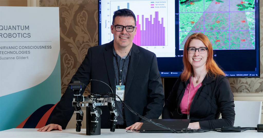 Nirvanic are developing a quantum consciousness test platform to test theories on the possibility of quantum mechanics being responsible for consciousness. The test setup takes input from a webcam attached to a robot, sends the data to a D-wave quantum computer, which then returns a desired action for the robot to take. The idea is to compare the quantum powered setup with a classical system to see if there are any differences in the actions returned from the camera input.