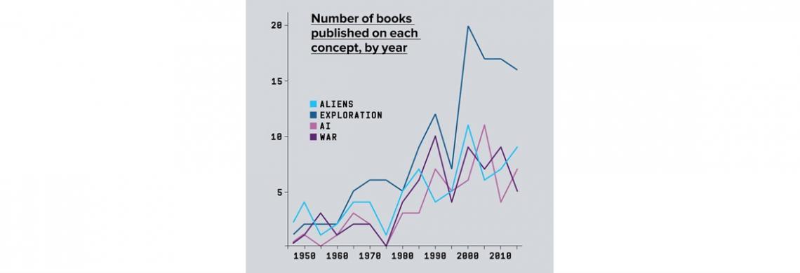 Data Scientist Eric Berlow has analysed 100 years of Science Fiction output and analysed and categories the data. Theme trends show that exploration has seen a boom in recent years, but aliens are also on a comeback. The data also shows that the topic of AI has been re-introduced in the last 30 years.