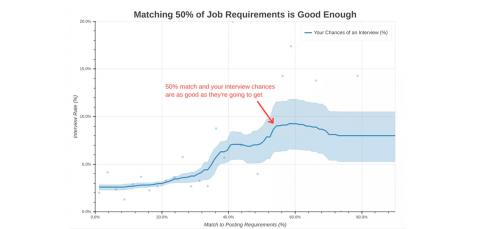 Talent Works analysed 6000+ applications across 118 industries and have found that applicants are as likely to get an interview when meeting 50% of the advertised job requirements as meeting 90% of the requirements. The also found that women who match at least 30% of the requirements have increasing chances of getting an interview.