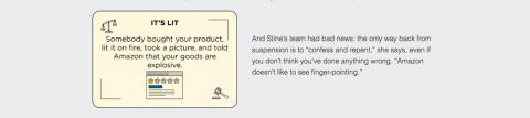 This is a fascinating long read by The Verge about the cut-throat goings on between super-competitive Amazon Marketplace sellers. A sub-industry has formed of "Amazon Lawyors" that help sellers recover from attacks by other sellers. Sellers have learnt to use new rules and terms against each other whenever Amazon introduces new legislation to their marketplace. When the hoverboards started exploding, Amazon cracked down on flammable products.
