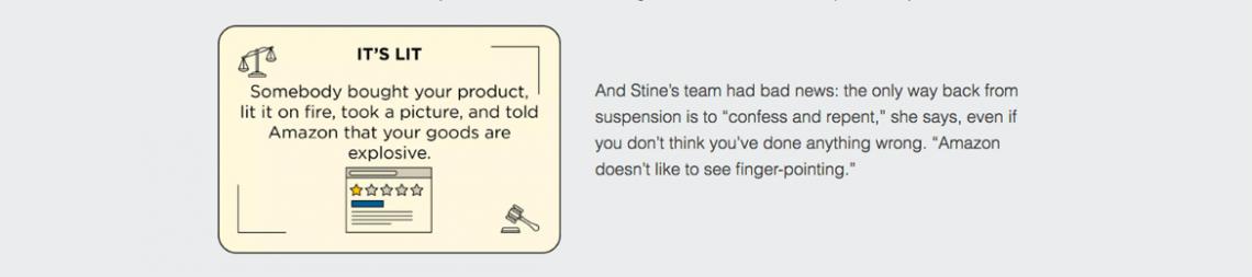 This is a fascinating long read by The Verge about the cut-throat goings on between super-competitive Amazon Marketplace sellers. A sub-industry has formed of "Amazon Lawyors" that help sellers recover from attacks by other sellers. Sellers have learnt to use new rules and terms against each other whenever Amazon introduces new legislation to their marketplace. When the hoverboards started exploding, Amazon cracked down on flammable products. Sellers start buying their competitors products, setting them on fire and leaving reviews about the explosive products, causing an immediate take-down of their competitors products form the marketplace, and that's just one type of marketplace attack!