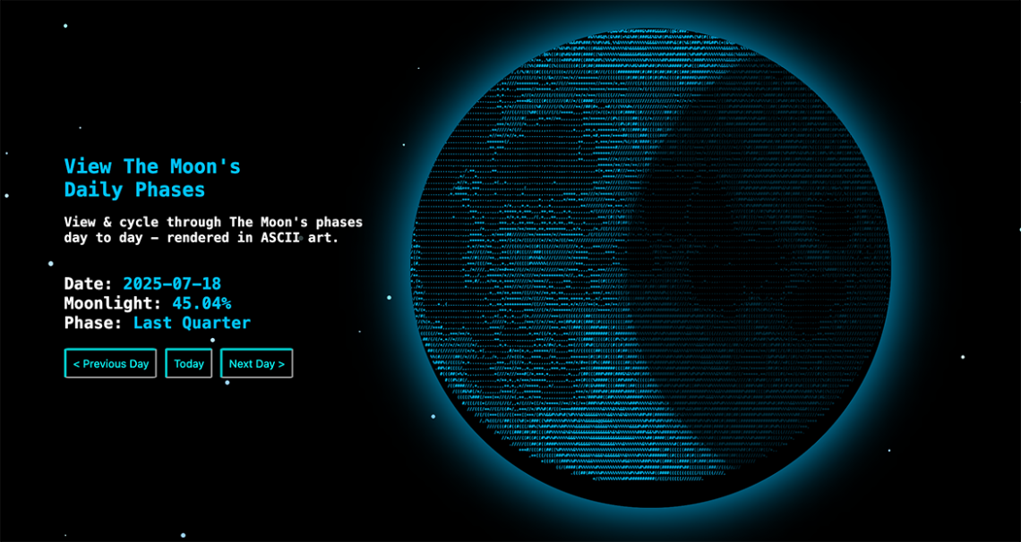 Image: ASCII Moon #426ASCII Moon shows you the current phase of the moon using ASCII art. Source: ASCII Moon Data Vis