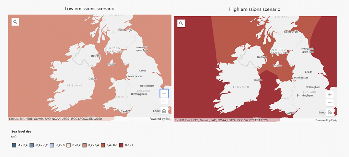 ESRI published a set of Climate Change Impact maps for Europe using their ARCGIS software. The maps show comparisons between low emmissions and high emmissions scenarios for sea levels, droughts, income for farmers, flooding and fires.