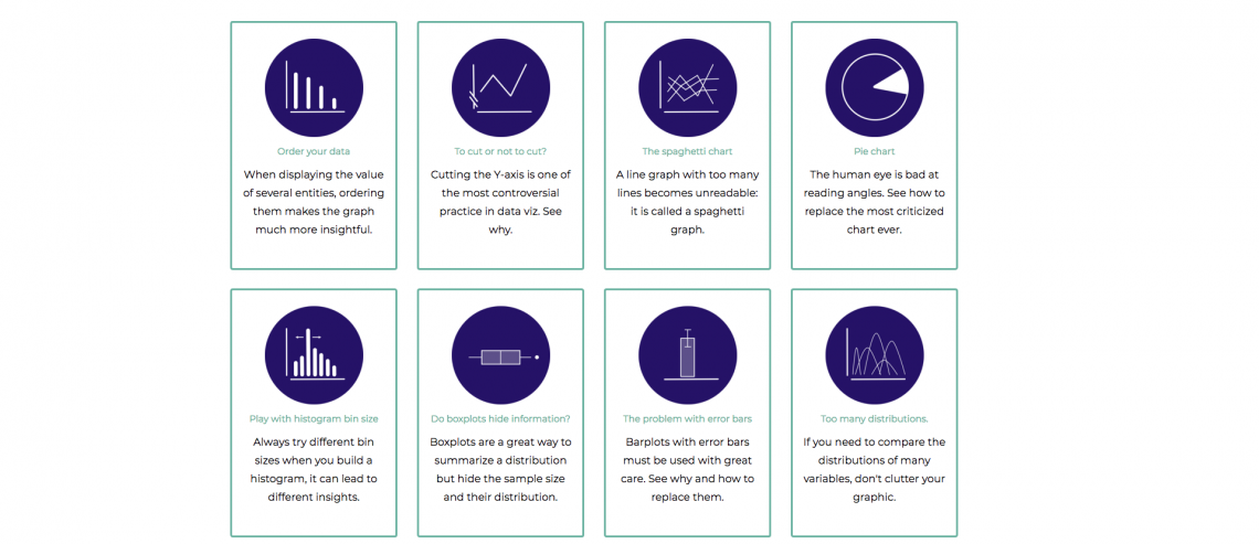 This is an excellent resource on the many pitfalls to avoid when using the many many different types of data visualisation methods and graphs. The site gives some nice examples of dos and don'ts for each graph type.