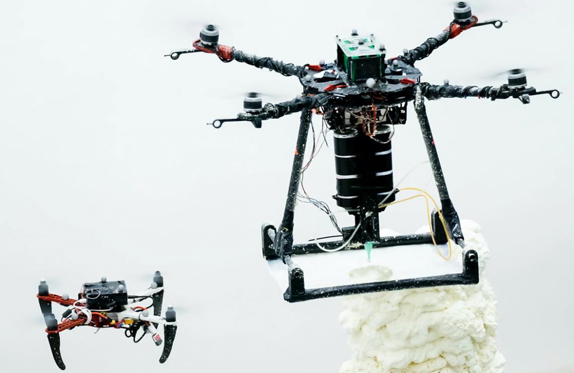 Researchers from Imperial College London and Switzerland's Empa institute have developed a system to deployed automated flying 3D printer drones which can be used to print structures in awkward to reach or inhospitable places. Inspired by bees, the Aerial Additive Manufacturing system (humourously) consists of two drones working together, one worker drone that does the printing and one gaffer drone that monitors the work and directs the worker drone to stick to the blueprint if it veers off script.