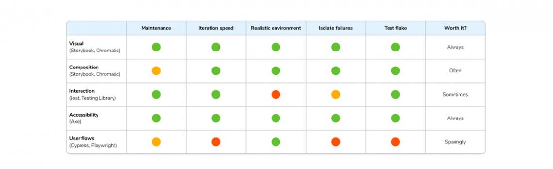 Varun Vachhar on Storybook.js published a useful framework for testing UIs which covers visual, composition, interaction, accessibility, and user flow testing. The framework gives an overview looks at how to test in each category and scores each using dimensions such as iteration speed, maintenance, and isolating failures.