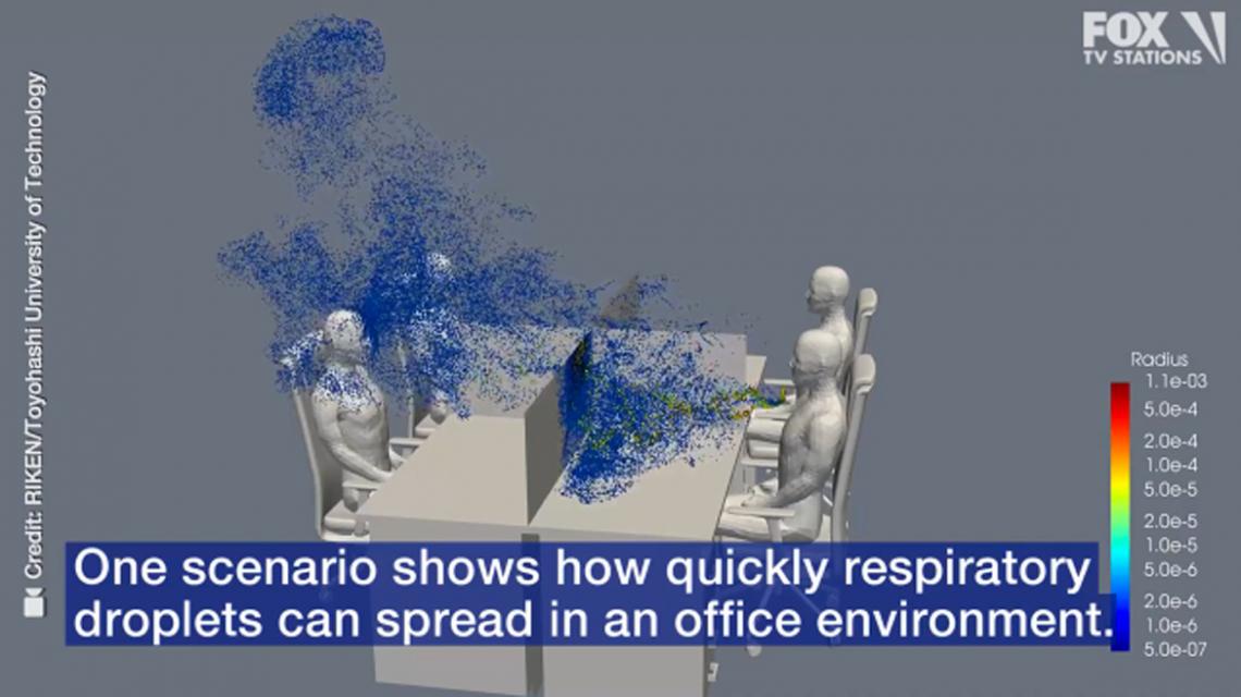 The Japanese Fugaku supercomputer produced a particle simulation of COVID-19 spread in an office environment. Running 416 quadrillion calculations per second, the supercomputer simulation shows how ineffectual office partitions are over time at containing the spread of COVID-19 aerosols.