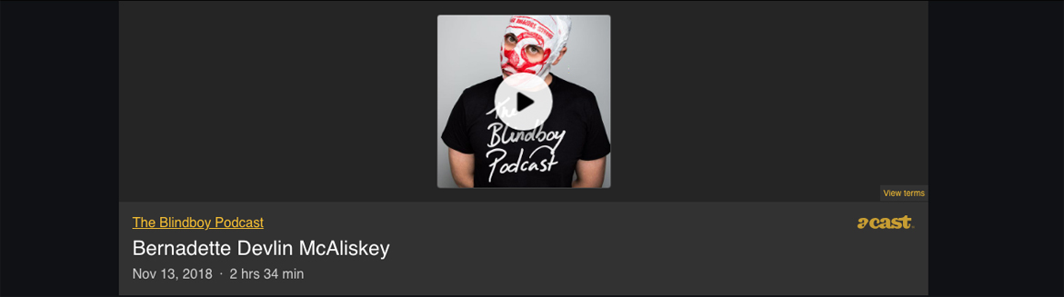 The Blindboy Podcast is providing a service to society with his podcast, that covers every topic under the sun in a manner in which only he can. Many a time, topics of national importance such as mental health, direct provision and cognitive psychology are covered and discussed. His podcast hug episodes are interspersed with some of the most amazing live interview podcasts you will hear, such as his interview with Bernadette Devlin McAliskey.