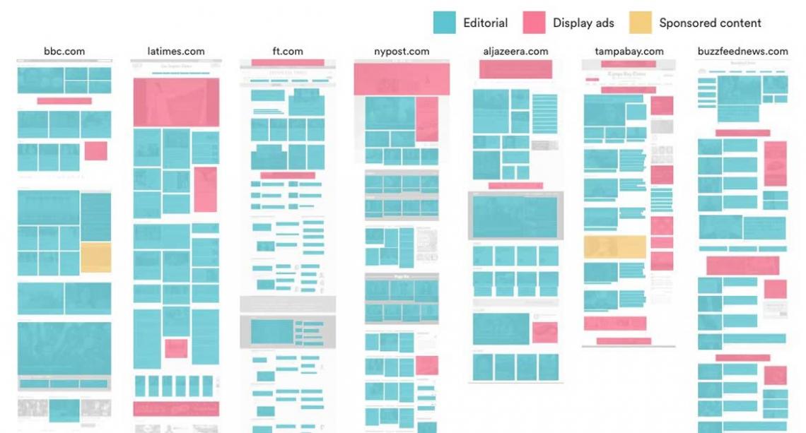 Noah Veltman of Netflix has produced this nice data visualisation of how different news websites layout and priorise their editorial, ads and sponsored content.