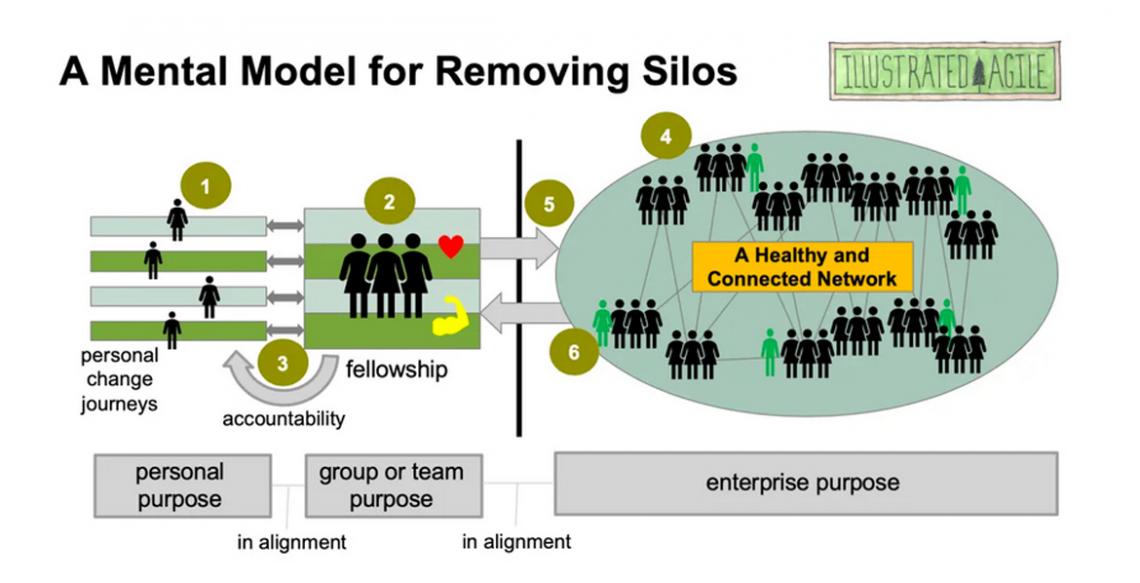 Illustrated Agile are runing an excellent article series that deals with organisation silos. Part two of the series deals with how to work towards removing silos, by encourage personal journeys, developing fellowships and building accountability into the organisation.