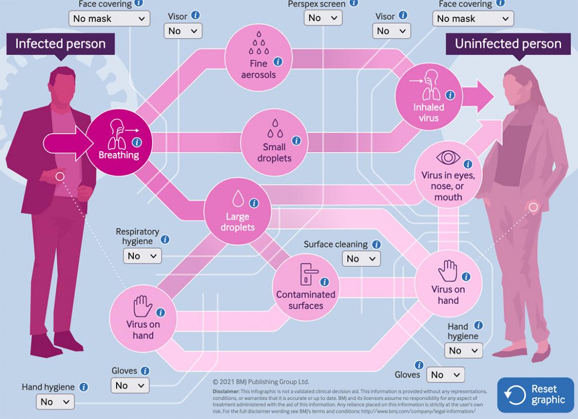 The British Medical Journal published an excellent interactive tool to visualise the estimates of COVID transmission as defined by experts in different scenarios. TL;DR; It's airborne, wear a FFP3 mask.